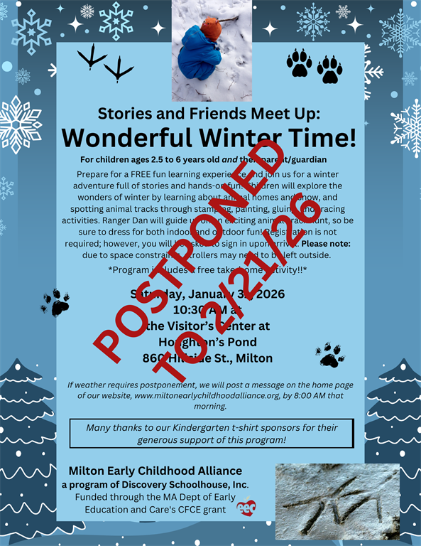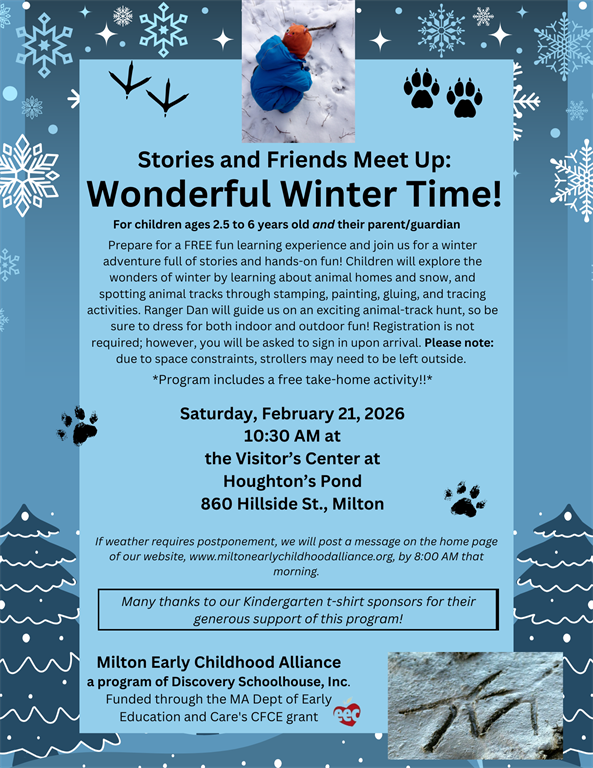 StoryWalk® at the Trailside Museum A free self-guided story, posted on the fencing along the outdoor walking path, for you to read with your child while enjoying a walk and fresh air. Trailside Museum 1904 Canton Ave., Milton Please follow appropriate COVID-19 guidelines to protect you and your family by maintaining at least a 6 foot distance from others in the area and remaining at a story page until the next story page is free and available for reading. Visitors are welcome at Trailside Saturdays and Sundays 10am-4pm by preregistration at www.massaudubon.org/reservations. Free tickets for the weekend are available for reservation on Wednesday afternoons for the following weekend.
